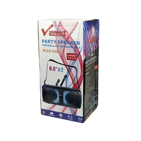 اسپیکر Vanmaax MAX-550 در غالب اسپیکر چمدانی بی سیم و با استفاده از متریال مرغوب پلاستیکی تولید شده است. طراحی ظاهری محصول امکان قرارگیری عموی و افقی بدنه را فراهم کرده و تعبیه دسته و بند همراه، موجب جابجایی آسان تر خواهد شد. این اسپیکر از توان خروجی نامی (P.M.P.O) معادل ۱۵۰۰۰ وات و توان واقعی (RMS) برابر با ۳۰ وات با همراهی دو عدد ساب ووفر ۶٫۵ اینچی و یک توئیتر ۱ اینچی برای انتقال صدایی شفاف و قدرتمند بهره برده است. همچنین از قابلیت TWS به منظور اتصال دو اسپیکر مشابه از یک منبع بلوتوثی و پخش همزمان یک آهنگ پشتیبانی می کند که به تقویت صدای قابل پخش از اسپیکرها خواهد انجامید. تامین انرژی Vanmaax مدل MAX-550 توسط باتری داخلی به ظرفیت ۳۶۰۰ میلی آمپر ساعت با میزان ماندگاری حدود ۲ ساعت در ولوم ۱۰۰% انجام می شود و شارژ مجدد آن از طریق پورت سوزنی با ولتاژ ۵ ولت DC وجود دارد.