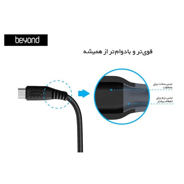 کابل شارژ بیاند مدل BA-311 USB-C با استفاده از روکش بافته شده از الیاف نایلونو از جنس رشتههای مسی ساخته شده است. کابل BA-311کاملاً استاندارد بوده و به دلیل جلوگیری از جریانات مرتعش، در استفاده طولانی مدت به باتری دستگاه شما صدمهای وارد نمی کند. وجود 4 مجموعه سیم مسی در این کابل باعث میشود که علاوه بر شارژ سریع، امکان انتقال اطلاعات را نیز داشته باشید و جنس هسته این کابل از مس است . به سبب داشتن روکش بافته شده از الیاف نایلون و استفاده از کابلهای مسی با کیفیت، قابلیت انعطافپذیری تا 180 درجه و عمر بیش از 12,000 بار تا شدن را دارد و با خم شدن مداوم به بدنهی کابل آسیبی وارد نمی شود. روکش بافته شده از الیاف نایلونی بسیار دوام بالاتری نسبت به کابلهای لاستیکی دارد و با استفاده مداوم دچار بریدگی یا تاشدگی در طول کابل نمی شود و باعث افزایش طول عمر کابل میشود