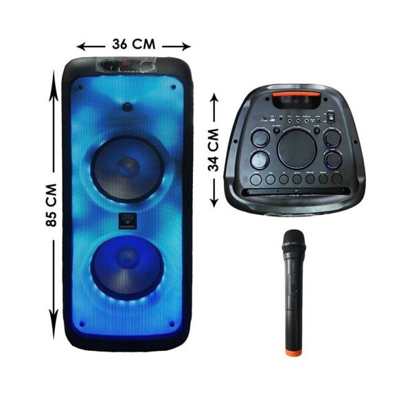 سپیکر بلوتوثی دیاموند مدل DX-BX2100 از نوع پارتی باکس و سفری تولید و در جشن و مهمانی ها و سفرهای شما کاربردی می باشد. اسپیکر DX-BX2100 ارتفاع 85 سانتی متر دارد و دارای پورتها و راههای ارتباطی USB T،F card reader ،Bluetooth 5 ،AUX است. باتری داخلی اسپیکر چمدانی دیاموند مدل DX-BX2100 قابل شارژ با توان 7.4 وات و 7200 میلی آمپر می باشد و شارژی پرتابل در این اسپیکر 4200 وات است. اسپیکر دیاموند مدل DX-BX2100 مجهز به ساب ووفر 10 اینچی، یک عدد میکروفون بی سیم، نمایشگر رقص نور با نورپردازی های جدید میباشد.
