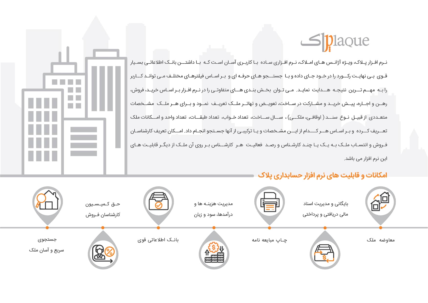 - نرم افزار حسابداری مشاورین املاک ( پلاک )، ویژه آژانس های املاک.