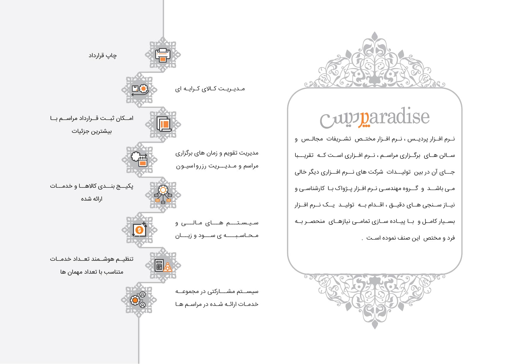 - بهترین نرم افزار تالار مجالس می باشد که به صورت اختصاصی جهت باغ و تالار مجالس، تشریفات، مراسمات، جشن ها و تالار عروسی طراحی شده است