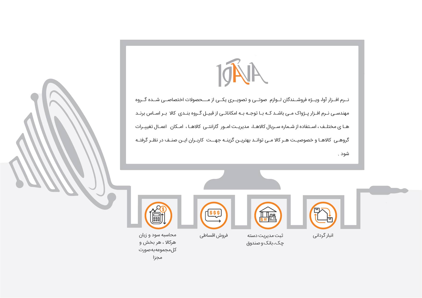 نرم افزار حسابداری آوا ویژه لوازم صوتی و تصویری از گروه نرم افزارهای حسابداری پرنس یک نرم افزار ساده و کارا است که به راحتی می توان اقدام به ثبت کالا و فاکتورهای خرید و صدور فاکتورهای فروش نمود و به صورت دوبل و با حداقل ورود اطلاعات حساب های اشخاص ،مدیریت انبار ،کاردکس کالا ،حساب های سود و زیان را مدیریت نمود و با ورود شماره سریال به سادگی می توان گارانتی کالاها را سامان دهی نمود.