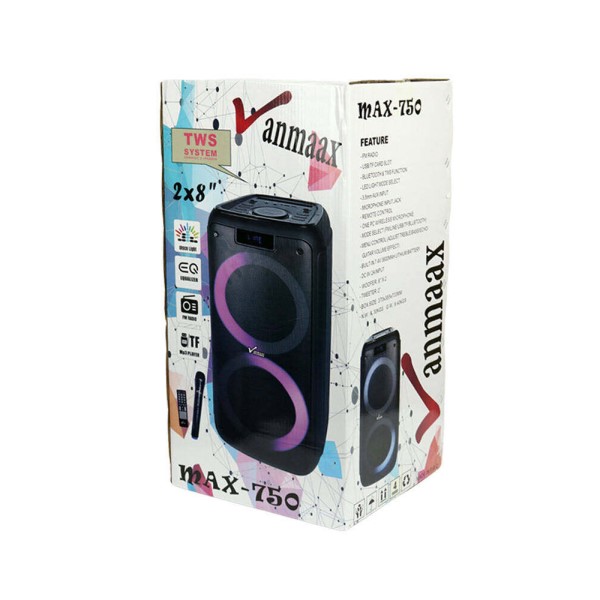 اسپیکر بلوتوثی MAX-750 از کمپانی وان مکس دارای ظاهری چمدانی با بدنه ساخته شده از متریال مرغوب پلاستیکی است. این محصول دارای ۲ عدد ساب ووفر ۸ اینچی و ۱ عدد توئیتر ۲ اینچی بوده که از توان خروجی اسمی ۲۰۰۰ وات و توان خروجی کلی ۲۵ وات برخوردار است. همچنین بهره مندی از نورپردازی داخلی با قابلیت مدیریت، موجب شده است تا جلوه بصری زیبایی از خود به نمایش گذارد. اسپیکر Max-750 دارای پنل حرفه ای تنظیم صدا بوده که شامل کلید های BASS موزیک، ضبط صدا، دسترسی به منو، اکولایزر و … می باشد. همچنین بر روی این پنل پورت های ورودی USB و TF Card با هدف پخش پلی لیست مورد علاقه کاربران از فلش مموری USB و کارت حافظه Micro SD مشاهده می شود. دیگر راه های اتصال به اسپیکر شامل اتصال بی سیم از طریق بلوتوث و اتصال باسیم به وسیله رابط جک ۳٫۵ میلی متری صدا است.