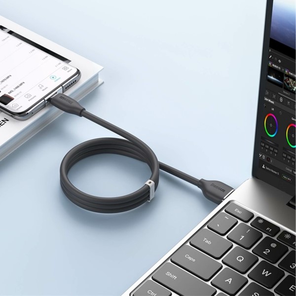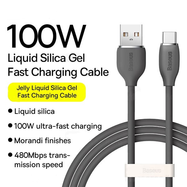 کابل شارژ تایپ سی JELLY LIQUID SILICA GEL بیسوس یک شارژر با جریان 5 آمپر و توان 100 W و همچنین سرعت انتقال داده 480 مگابیت بر ثانیه است