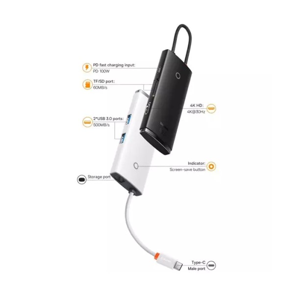 این هاب دارای پورت های USB 3.0, HDMI, Type-c, TF, SD است که از طریق یک کابل type C کار انتقال داده را انجام میدهد