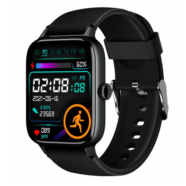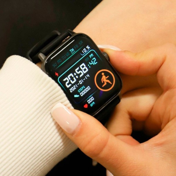 سایز صفحه نمایش 1.54اینچ با پنل IPS لمسی و رنگی، طراحی شده در فرم مستطیلی، جنس بند از نوع سیلیکون و دارای قفل بند سگکی ساده