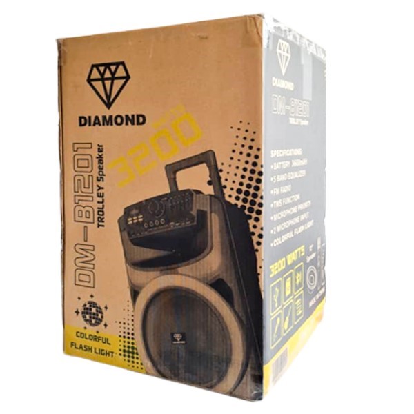 اسپیکر قدرتمند شارژی و قابل حمل بلوتوثی دیاموند مدل DM-B1201 با طراحی زیبا و جمع و جور میتواند به راحتی برای مهمانیهای شما در هر جایی که دوست باشید تجربهی لذتبخشی به ارمغان آورد. این اسپیکر قدرتمند همراه با ۲ عدد ساب ووفر ۱۲ اینچی چراغدار همراه با نمایش رقص نور با نورپردازی جدید عرضه میشود. این اسپیکر دارای پورتها و راههای ارتباطی USB TF card reader ،Bluetooth 5 ،AUX میکروفون ورودی و رادیو FM همراه با کنترل است.