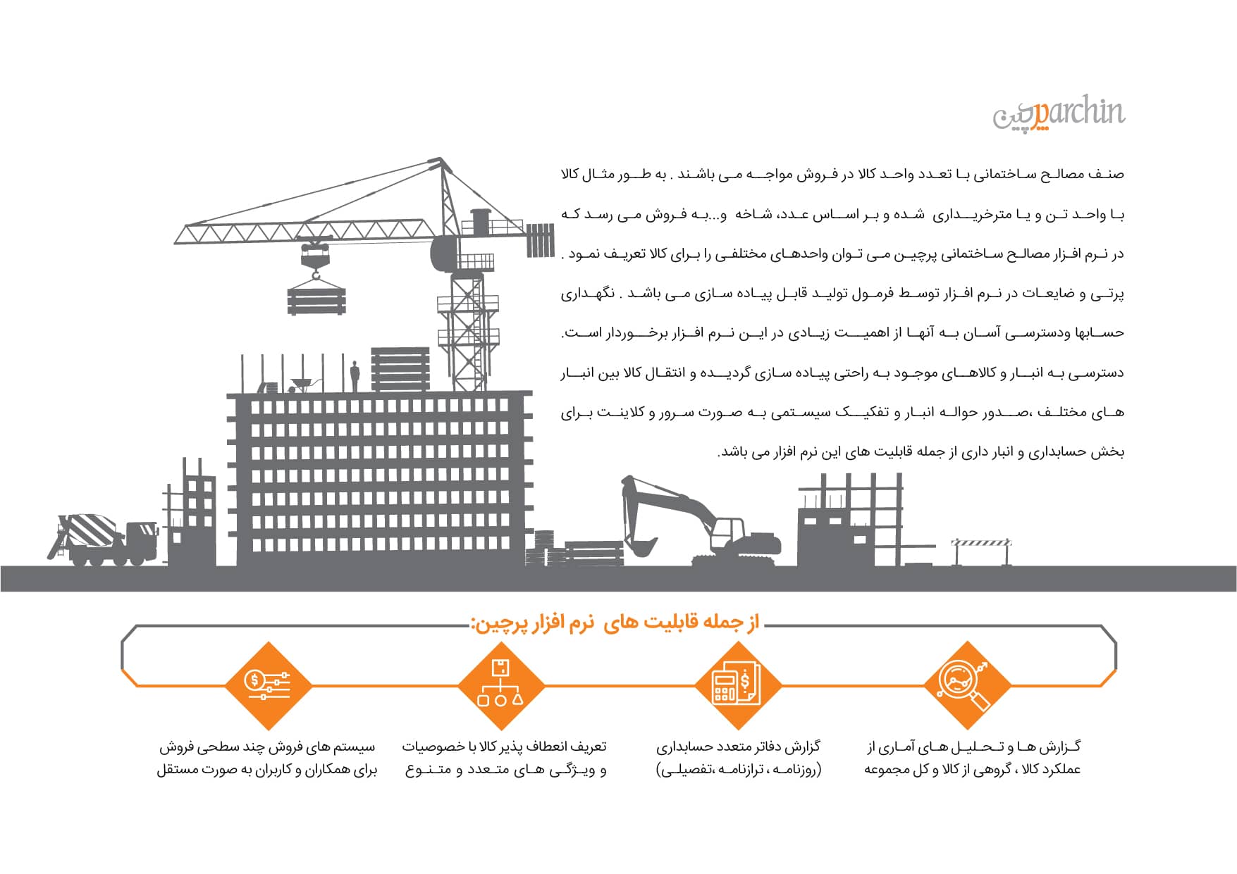انتخاب واحدهای متفاوت در خرید و فروش و همچنین امکان ترکیب و تفکیک کالاها به یک و یا چند کالای جدید و محاسبه قیمت تمام شده کالاها و در صورت استفاده از فیچر فرمول تولید پاسخگوی بسیاری از نیازهای تخصصی فروشندگان مصالح ساختمانی می باشد .