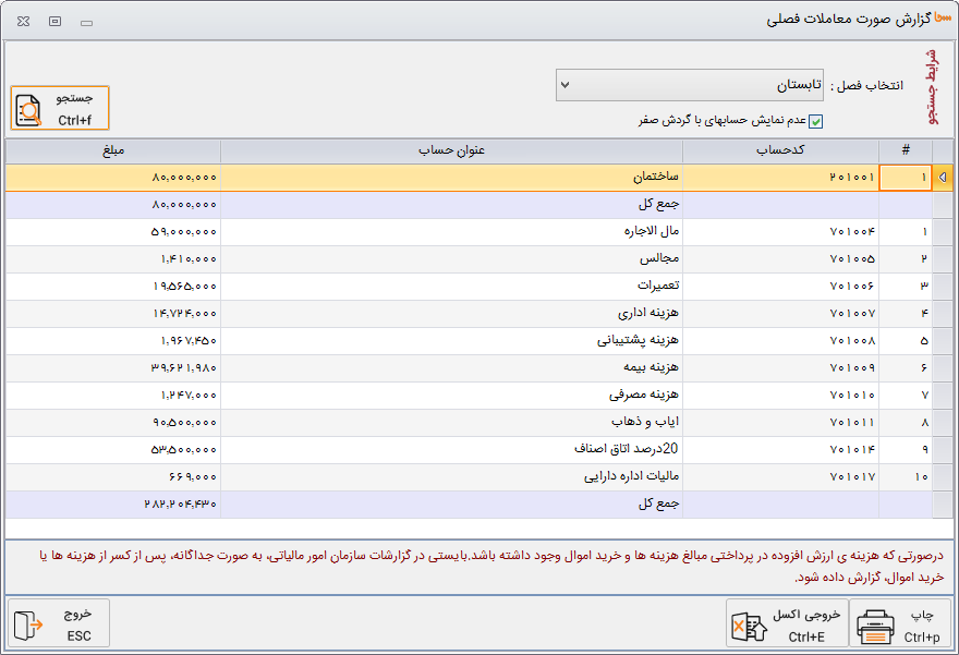 گزارش معاملات فصلی به تفکیک فصل و سرفصل های مربوطه
