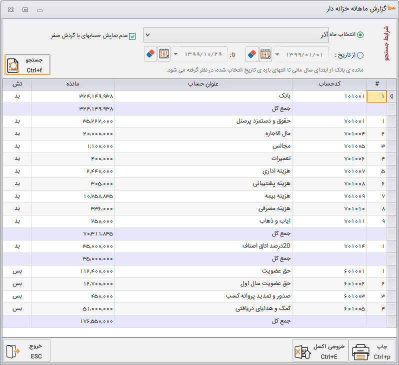 گزارش خزانه دار به تفکیک ماه و سرفصل های مربوطه